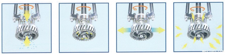 物料在水锅、油锅内通过加热、搅拌进行混合反应后,由真空泵吸入乳化锅,通过乳化锅内上部的搅拌、聚四氯乙烯刮板迎合搅拌锅形体,扫净刮壁粘料,使被刮取的物料不断产生新界面,再经过叶片与回转叶片的剪断、压缩、折叠,使其搅拌、混合而向下流往锅体下方的均质器处,物料再通过旋转的切割轮与固定的切割套之间所产生的强力的剪断、冲击、乱流等过程,在剪切缝中被切割,破碎成200nm-2um的微粒,由于乳化锅内处于真空状态,物料在搅拌过程中产生的气泡被抽走。