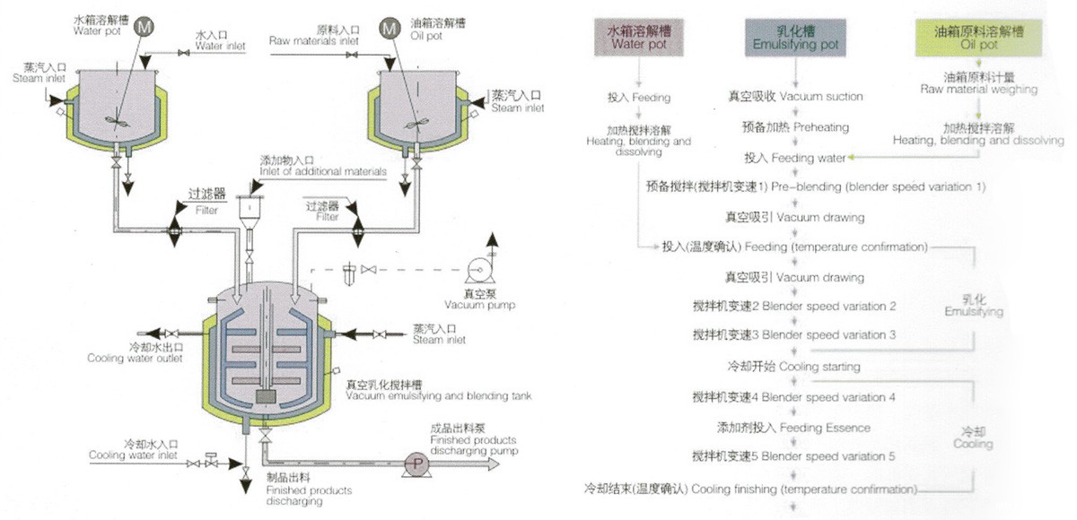 料锅锅盖为自动升降式,水锅、油锅中的物料通过输送管道可在真空状态下直接吸入乳化锅,出料方式为乳化锅锅体翻转可倾式,通过电热管对锅夹层内的导热介质进行加热来实现对物料的加温,加热温度任意设定,自动控制。在夹层内接入冷却水就可以对物料进行冷却,操作简单、方便,夹层外设有保温层。均质搅拌与桨叶搅拌可分开使用,也可同时使用。物料微粒化、乳化、混合、调匀、分散等可于短时间内完成。与物料接触部位采用不锈钢(医用采用316L材料制造,内表面镜面抛光,真空搅拌装置卫生清洁,采用符合GMP规范的卫生标准制造)。